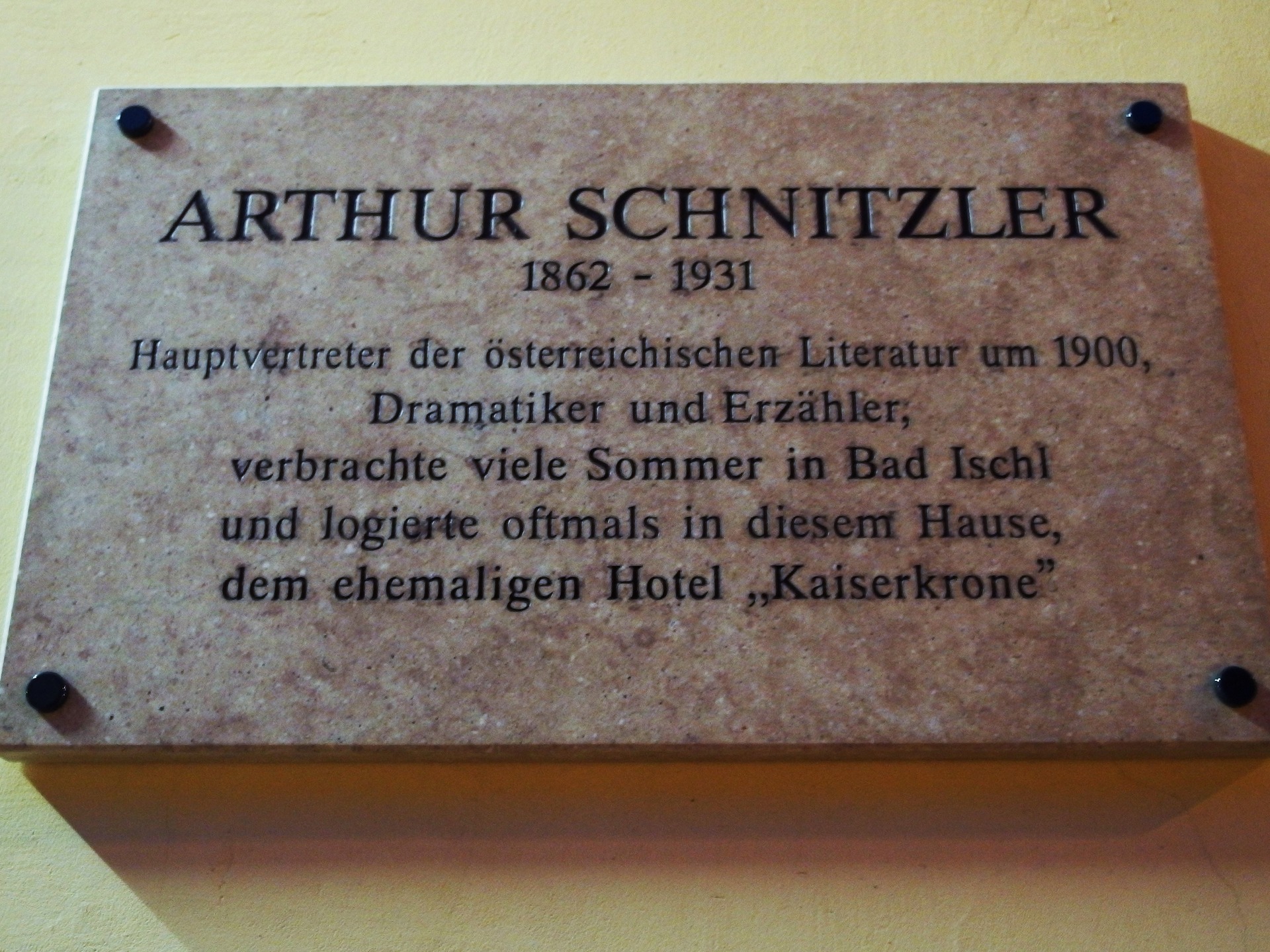 Im Rahmen des Projektes "Literatenspaziergang" wurde am 13.11.2015 in Bad Ischl auf dem ehemaligen Hotel Kaiserkrone in der Salzburger Straße eine Gedenktafel an Arthur Schnitzler enthüllt.